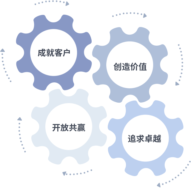 成就客户是一切决策的出发点,创造价值是衡量所有工作的标准,追求卓越是彩神V大发做事做人的态度,开放共赢是彩神V大发的格局也是最终的结果。价值观的齿轮环环相扣,推动着组织里的每个人不断向前。